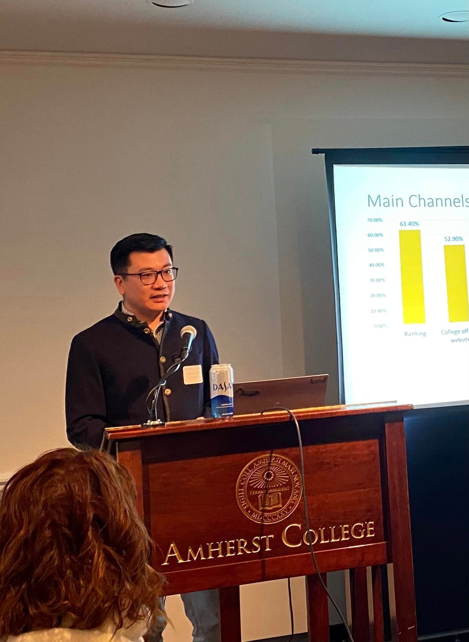 From 2015-2024, he served as an Associate Dean of Admission and the Coordinator of International Recruitment at Amherst College, a prestigious, highly selective, liberal arts college in Amherst, Massachusetts. He was the first Chinese national to be hired for this position in Amherst's history and one of a rare few foreign nationals in highly selective college admissions in the United States.